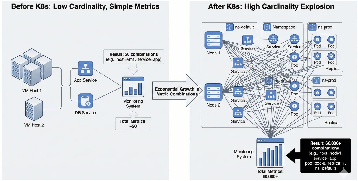Consider a traditional deployment with 10 services across 5 hosts. This generates about 50 unique metric combinations. If you move that same application to Kubernetes, you might have 200 services with 20 pods per service across 3 replicas and 5 namespaces. That equals over 60,000 unique metric combinations. When you add distributed tracing with trace IDs, span IDs, pod names, and container IDs, the numbers become staggering.