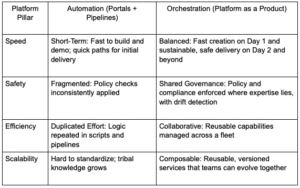 To avoid the platform façade, teams must move from automation to orchestration. Here’s how the two approaches compare, framed around the four key platform pillars of speed, safety, efficiency and scalability:
